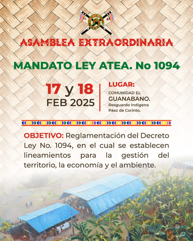 El 17 y 18 de febrero, en el Resguardo Indígena Páez de Corinto, se llevará a cabo una Asamblea Extraordinaria con el propósito de reglamentar el Decreto Ley ATEA No. 1094, en el cual se establecen los lineamientos para la gestión del territorio, la economía y el ambiente.